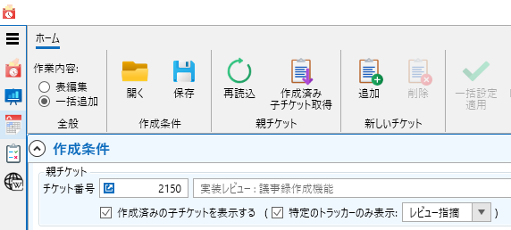 入力画面の左から「チケット表編集」を選択し、作業内容で「一括追加」を選択し、チケット一括追加画面を開きます。次に「親チケット」のチケット番号を入力して、親チケットを選択してください。新しいチケットは、この「親チケット」の子チケットとして作成されます。